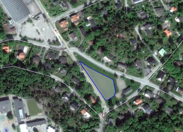 Gräsyta framför Stortorp bygdegård där en dagvattendamm kan anläggas. Foto: WRS och Naturvatten (2017).
