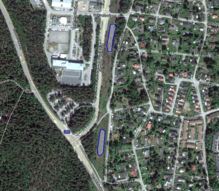 Under kraftledningen öster om Skrubba Malmväg finns två stora gräsytor som bedöms vara lämpliga platser för anläggning av kompletterande dagvattendammar eller infiltrationsanläggningar. Området ligger på isälvssediment enligt SGU:s jordartskarta varför förutsättningar för infiltration kan finnas. Kraftledningen talar emot att marken behövs för annan planläggning inom en nära framtid.