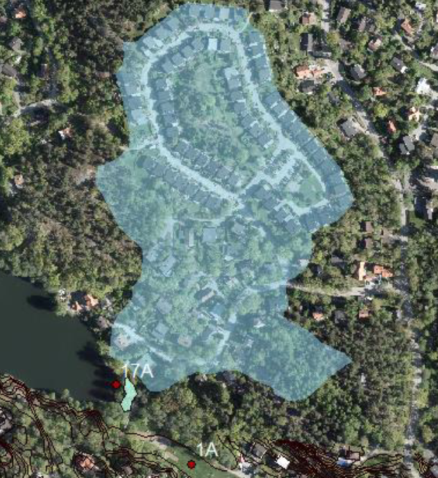 Området som avrinner till den tänka våtmarken består idag till stor del av kuperad tomtmark och detta medför att det på flera platser är svårt att leda dagvattnet till ytliga dagvattenlösningar uppströms i området. Därför är en våtmark vid utloppet mer passande. Reningseffekten i våtmarken uppskattas till 1,9 kilo fosfor/år.