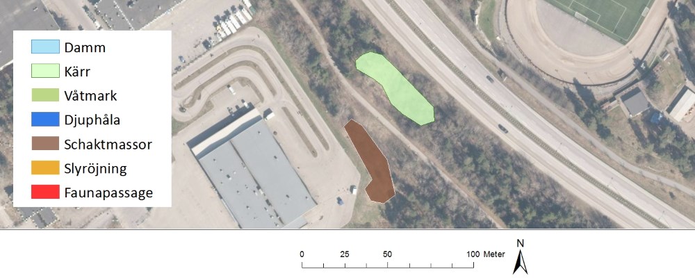 I höjd med Högdalens industriområde vid Örbyleden och intilliggande våtmarken Gökdalen finns ett långsmalt kärr som är i behov av restaurering för bland annat groddjur. Här finns nämligen observationer av åkergroda från 90-talet. Kärret är idag mycket igenvuxet av sälg och det håller inte vatten tillräckligt länge för att fungera optimalt som reproduktionslokal för groddjur.