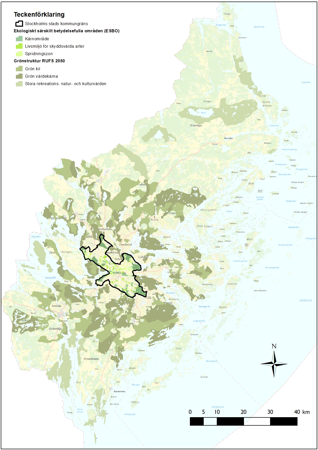 Kartan ovan visar även delar av den regionala grönstruktur som Stockholm är en del av. Denna kan ses i sin helhet i en bild som länkas längst ner på sidan.