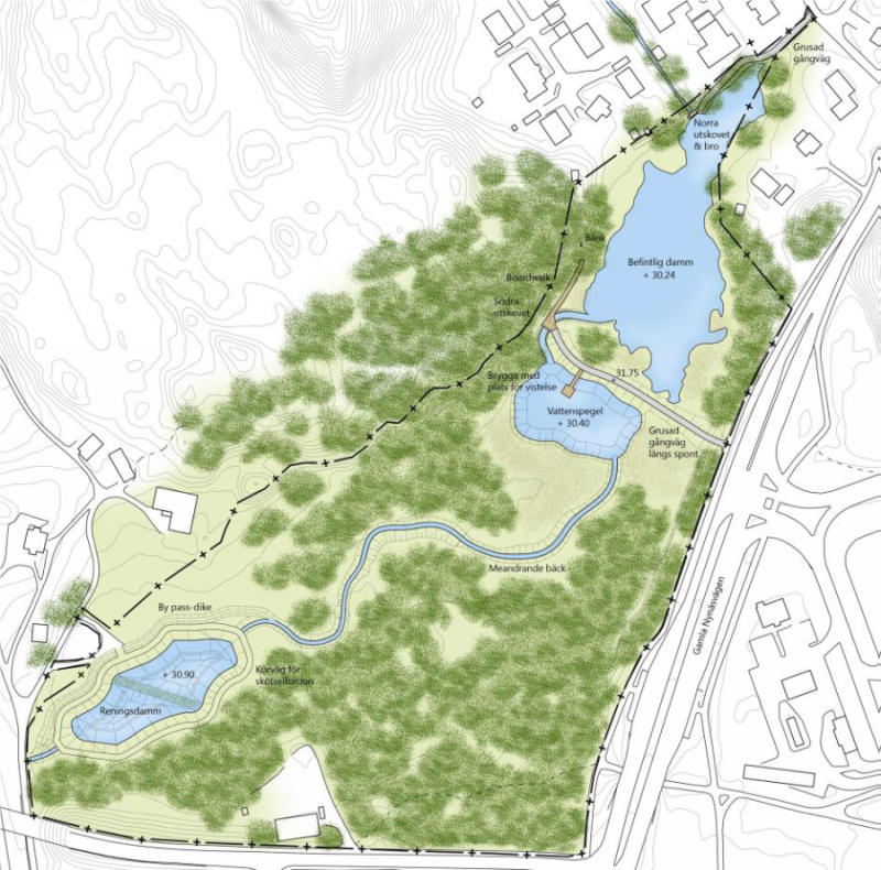 Två nya dammar har anlagts uppströms den befintliga dammen Dammträsk. Först passerar vattnet en renande fördamm där det renas från olja och större partiklar som sand och grus. Vattnet rinner sedan vidare i ett slingrande dike till den övre dammen. Här finns även en brygga som man kan gå ut på. Den öppna vattenspegel som är Dammträsk idag bibehålls.